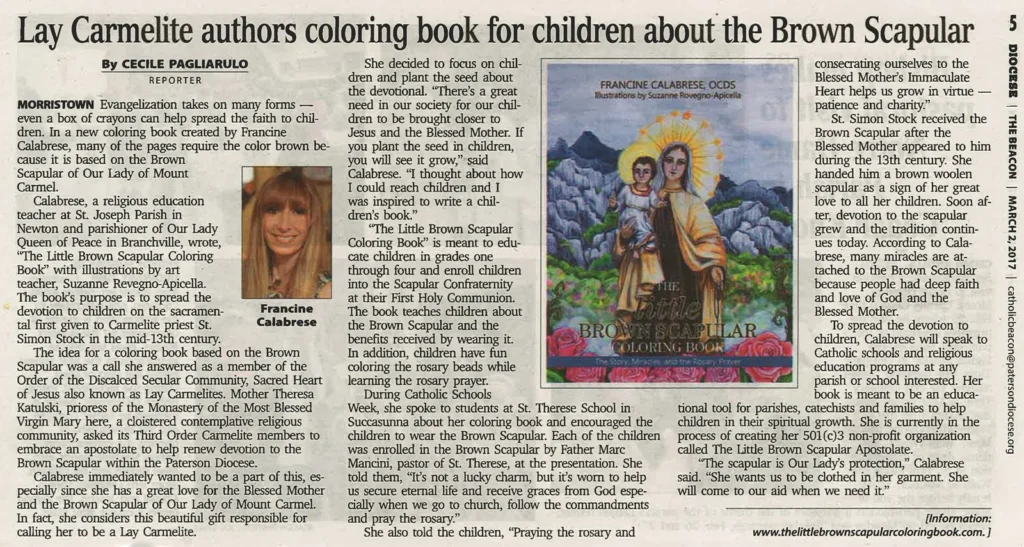 Francine’s great love for the Blessed Virgin Mary and the Brown Scapular of Our Lady of Mount Carmel is very dear to her heart. This beautiful gift is responsible for calling her into the Order of Carmel Discalced Secular Community, Sacred Heart of Jesus. There is a great need in our society for our children to be brought closer to Jesus and the Blessed Virgin Mary. Mother Prioress of the Monastery of the Most Blessed Virgin Mary asked the Secular Carmelite Community to embrace an apostolate to help renew this devotion within the Diocese of Paterson. Francine immediately wanted to be a part of this. Being a catechist teacher, it is her hope that The little Brown Scapular Coloring Book will educate and consecrate our children to Mary’s Immaculate Heart. Hopefully, it will provide parishes, Catholic schools, catechist teachers and families with a tool for educating our children that will benefit them in their spiritual growth.